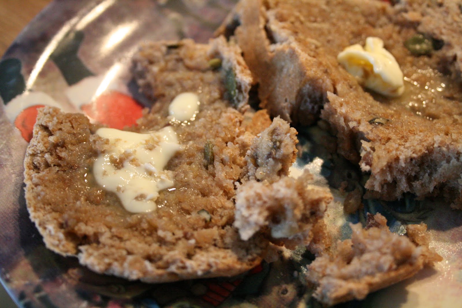 Brödet är bakat på bovetemjöl, spelt/dinkel (fullkorn, siktat och flingor) valnötter, sesamfrö, pumpafrö, linfrö, solrosfrö. Har sötat med lite sukrin och använt smör.